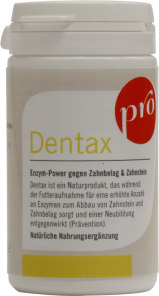 Dentax ist ein Naturprodukt, das während der Futteraufnahme für eine erhöhte Anzahl an Enzymen zum Abbau von Zahnstein und Zahnbelag sorgt und einer Neubildung derselben entgegenwirkt (Prävention).