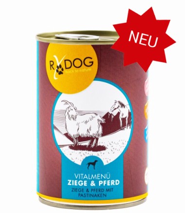 Mit zwei - selten in der Tiernahrung verwendeten - Fleischsorten haben wir ein neues Menü für Hunde zubereitet. Mit Ziege und Pferd haben wir eine sehr schmackhafte Kombination, die mit Pastinaken, Spinat, Johannisbeeren und Löwenzahn verfeinert wurde.